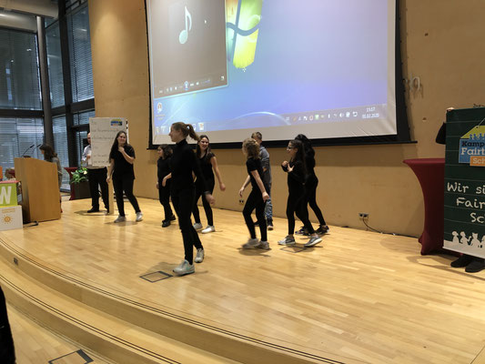 Auf Einladung des Landrats Oliver Quilling und des Kreistagsvorsitzenden Bernd Abeln beteiligten sich zwei Teams aus der Kreuzburgschule an den Feierlichkeiten zur Preisverleihung. Lehrerin Annalena Friedrich studierte mit zahlreichen Schülerinnen und Schülern im Vorfeld einen Tanz ein, zu dem Paula Niehoff die Choreografie lieferte. Mit dem Fairtrade-Song „Small Talk“ von Toni Geugelin und Paula Niehoff wird aufgezeigt, dass wir eine Verbesserung der Lebensbedingungen durch unsere Kaufentscheidungen in der Hand haben.